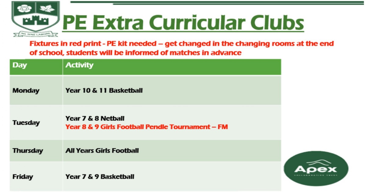 Please see above for this week's PE extra-curricular and sporting fixtures.